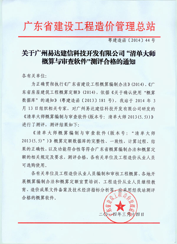 关于广州易达建信科技开发有限公司“清单大师概算与审查软件"测评合格的通知
