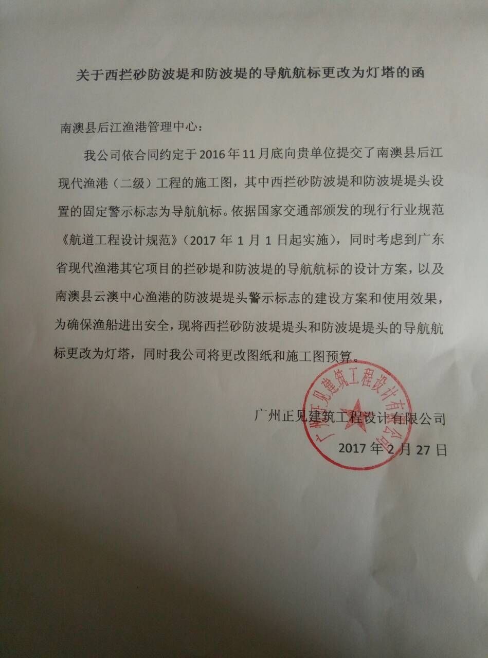 | 建设规模 | 建设渔业码头460米、防波堤167米、拦沙堤328 米、外护岸326米、内护岸50米,港池航道疏浚与陆域形成67.24万立方米、渔港综合管理中心1000平方米、水产品交易市场5000平方米,以及配套港区道路、水电消防、环保设施、导助航及监控指挥等设施。具体详见《南澳县后江现代渔港(二级)工程工程量清单》及广州正见建筑工程设计有限公司设计的相应施工图纸。 | ||