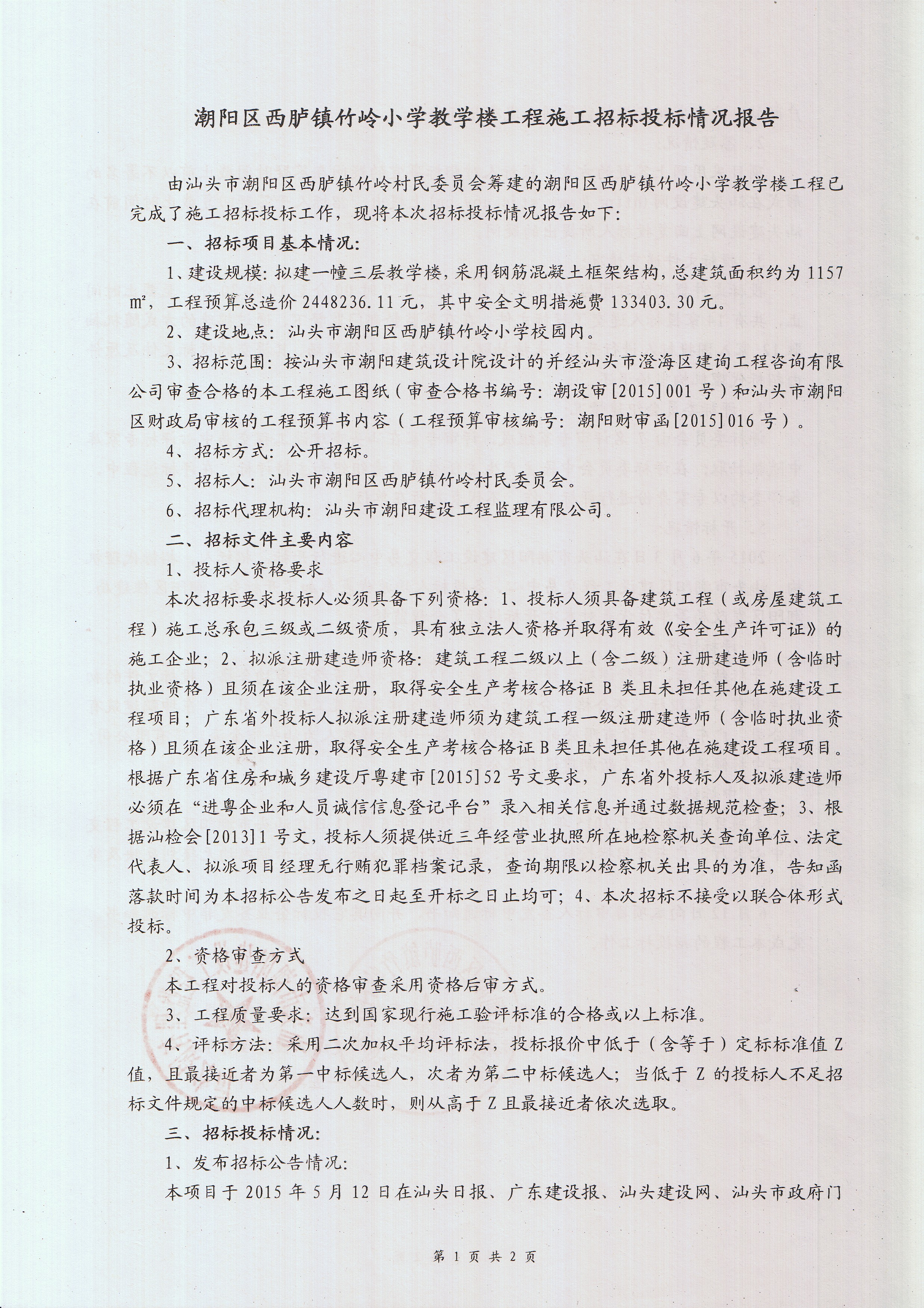 | 公告编号 | 潮阳建交(2015)11号 | 工程编号 | / |